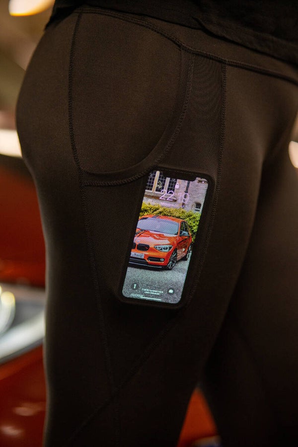 Schwarze Leggins aus Polyester mit zwei Seitentaschen.