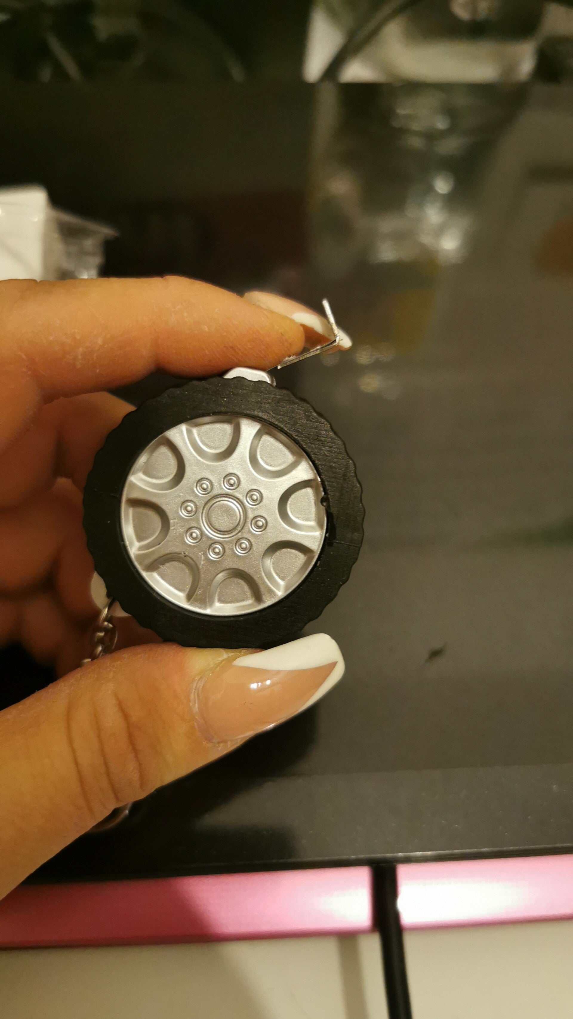 Ein Schlüsselanhänger im Reifen/Felgen Design mit Metermaß (100cm).
